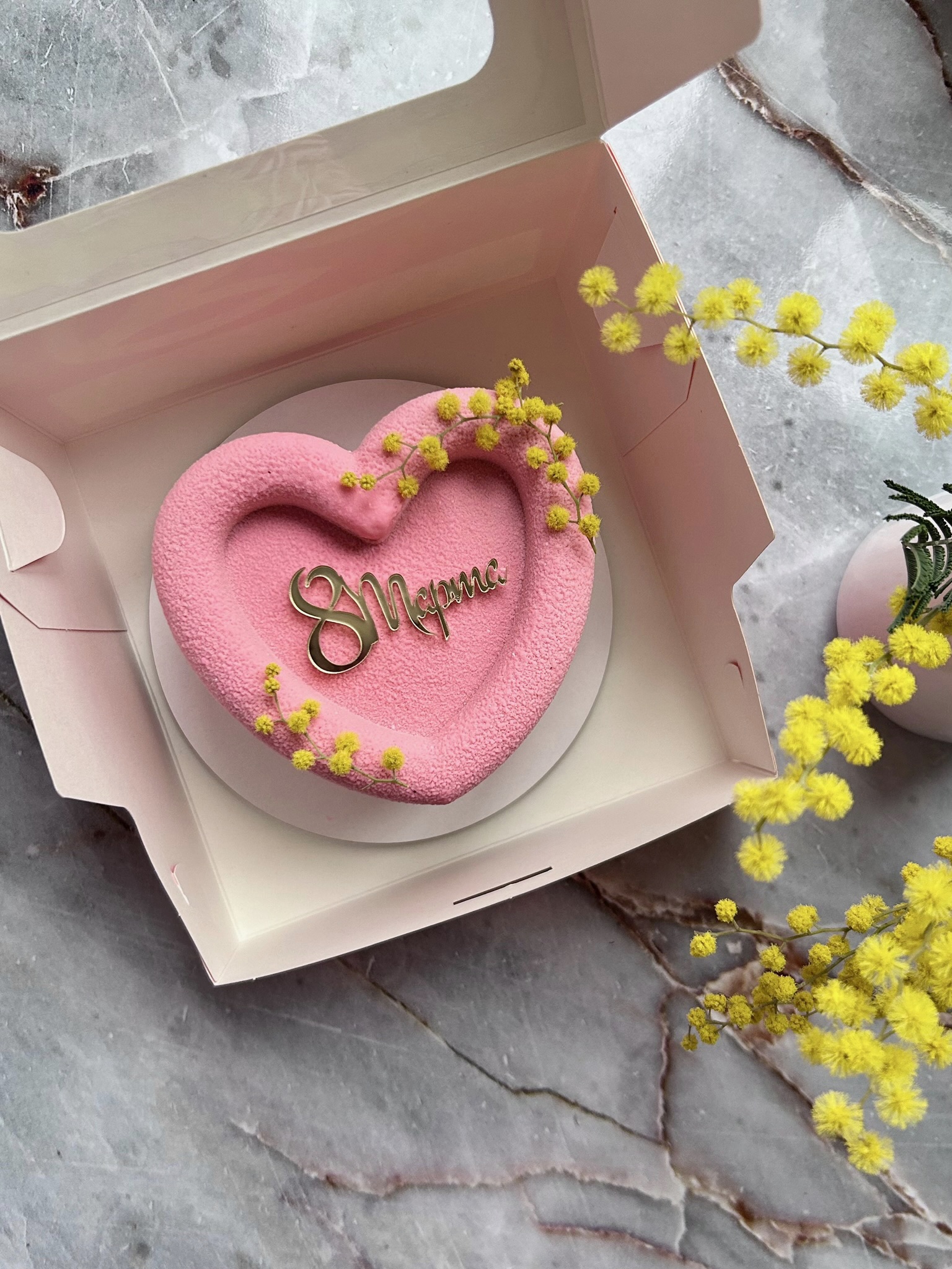 Мусовый торт с шоколадным покрытием велюр - Сердце на 8 Марта (Клубника со сливками)