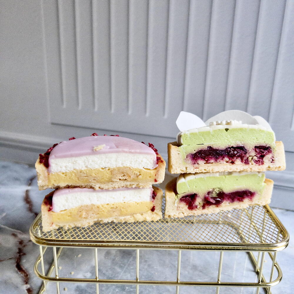 1. Чизкейк (Миндальная мука, мука пшеничная,сах пудра, соль, сливочное масло, яйцо, сыр творожный, маскарпоне, сливки, сгущенное молоко, ванильная паста, шоколад белый, пюре клубники, желатин, пектин) 2. 3. Тарталетки (Мука пшеничная, мука миндальная, сах пудра, масло сливочное, яйцо, соль, белый шоколад, вафля, сублимир. малина, пюре манго и маракуйи, молоко, крахмал, желатин, глюкозный сироп, сливки, фисташковая паста, пюре вишни, пектин, вафельная бумага) 4. Печенье Мадлен (масло сливочное, растительное, яйцо, сахар, глюкозный сироп, краситель пищевой красный, мука, какао алкализированное, разрыхлитель, пектин, бельгийский шоколад, мак, пюре манго и маракуйя)